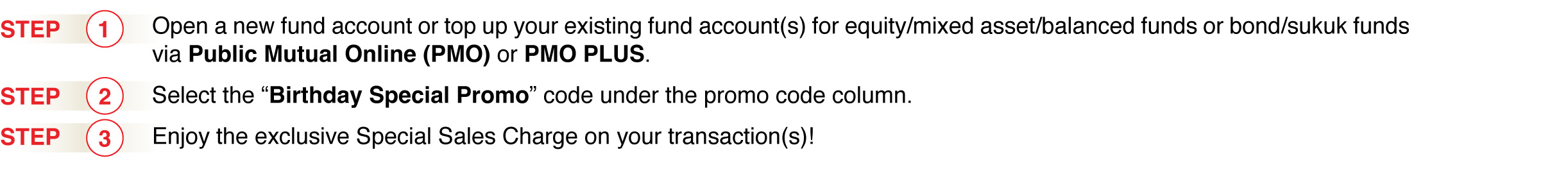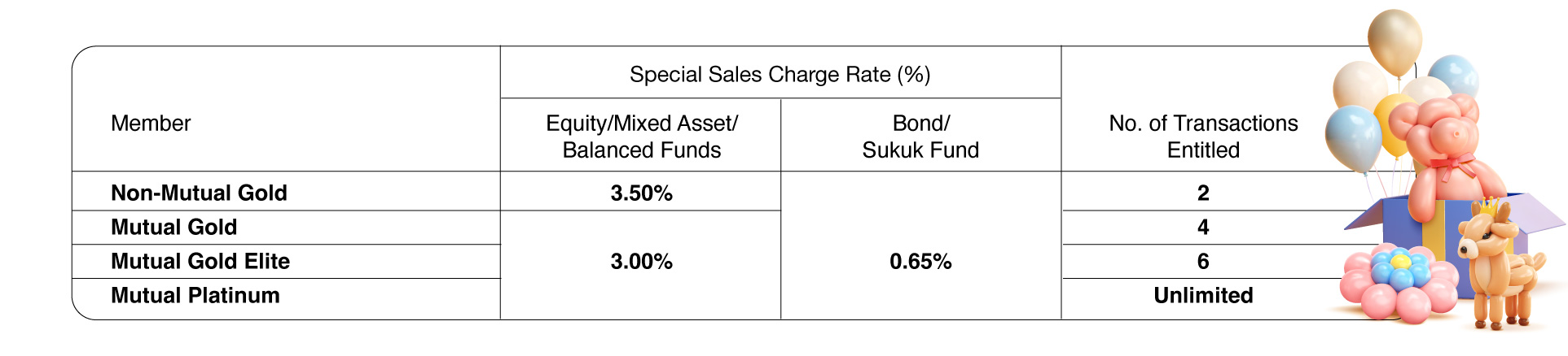 Enjoy a Special Sales Charge when you invest in equity/mixed asset/balanced funds and bond/sukuk funds with NO LIMITS to the investment amount for two (2) consecutive months starting from your birthday month.