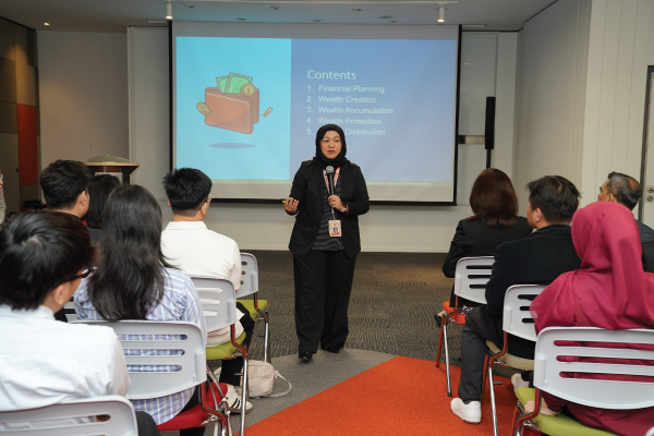 Group Agency Manager Mr. Afiq Syazwan bin Afandi from the Cheras branch delivered a resonating presentation about ‘Gen Z Glow Up: Get Rich without Giving Up Your Lifestyle’. Focused on the lifestyle of UPM students, Mr. Afiq aimed to promote good habits such as budgeting, saving, and investing early while also introducing them to the concept of financial planning for their future.