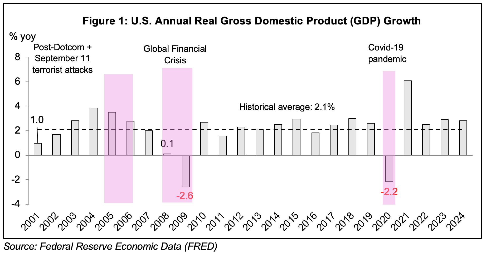 ![]() 2. Past hard and soft landings for the U.S. economy In the 2000s, the United States’ (U.S.) economy experienced both a soft landing (in 2001 post the dotcom boom and September 11 terrorist attacks) and a hard landing (during the 2008-2009 Global Financial Crisis, or GFC). As the U.S. economy’s growth moderated from 4.1% in 2000 following the dotcom boom to 1.0% in 2001 with most consumers and companies continuing to spend and invest, this economic slowdown was considered a ‘soft landing’.