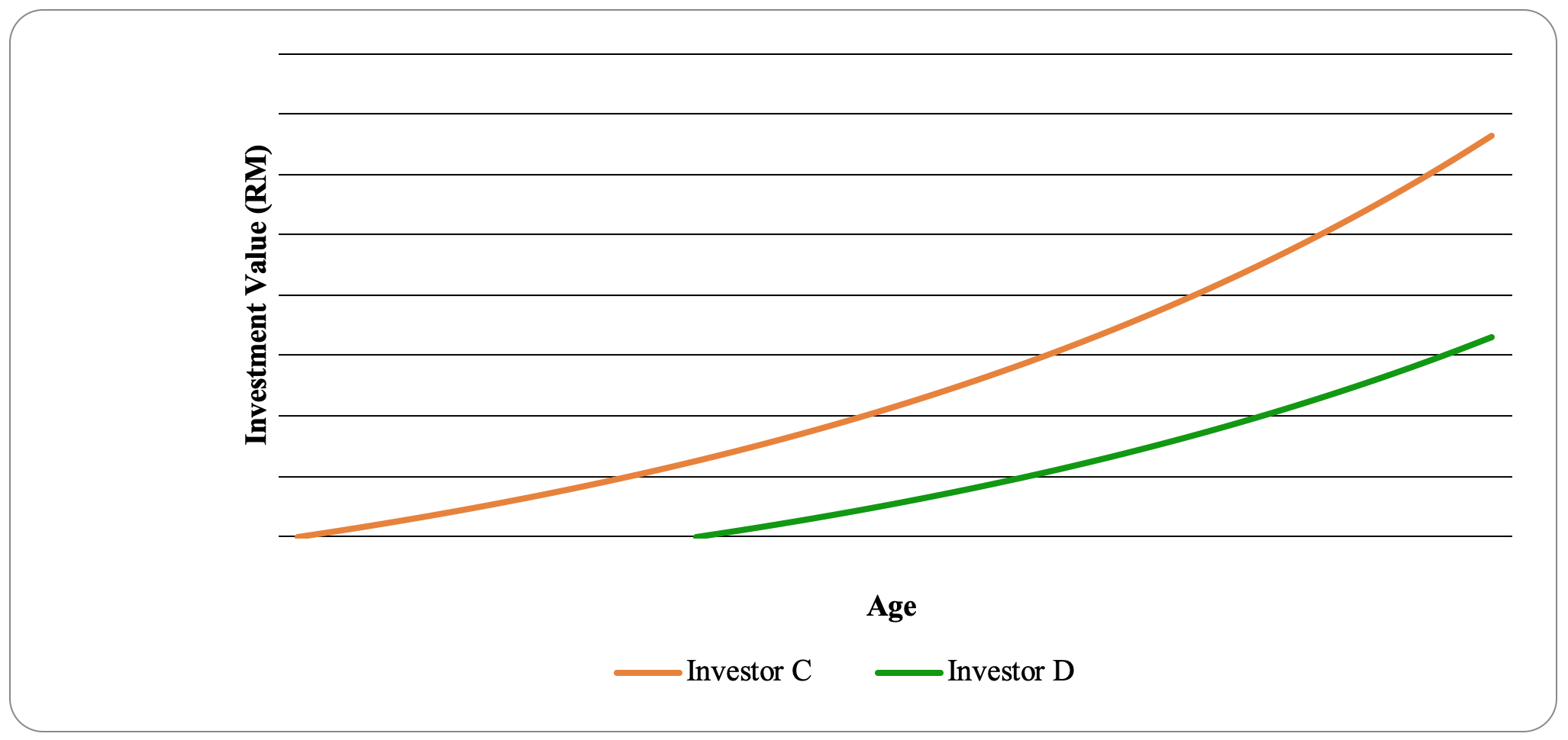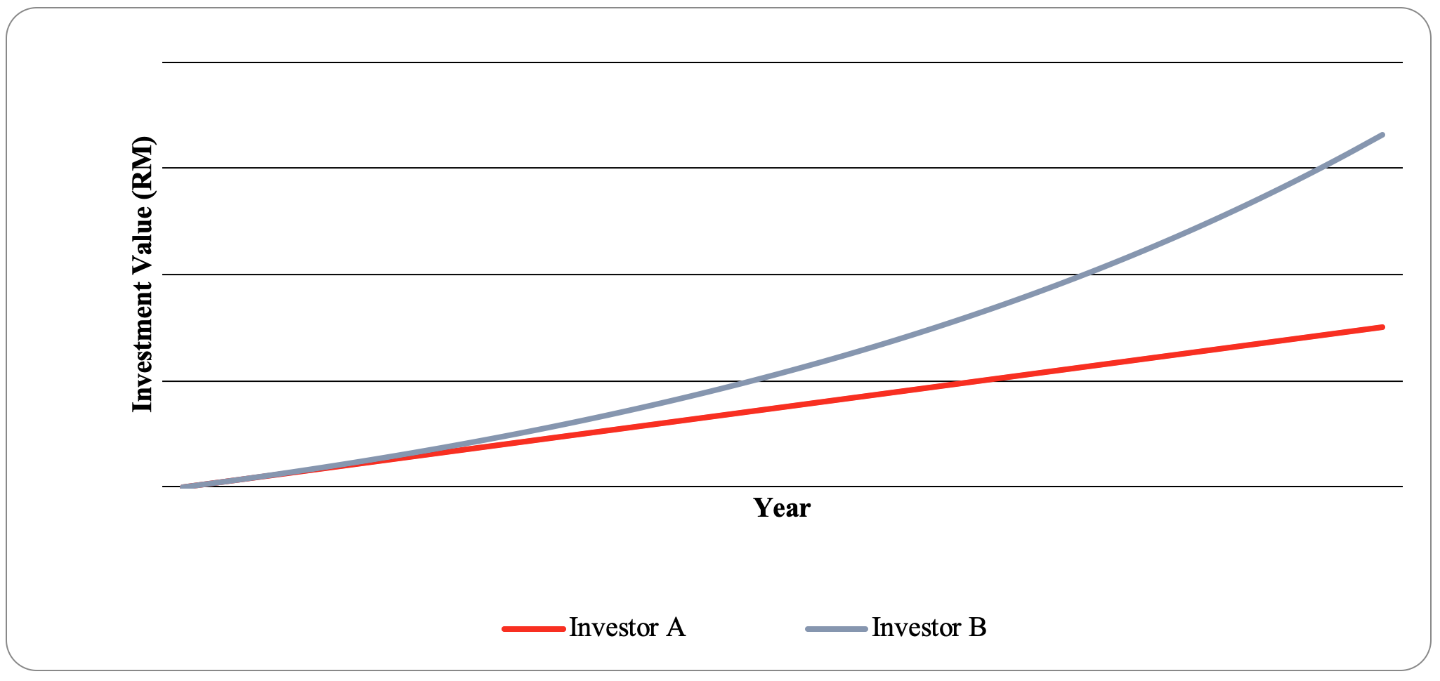 *Assume each investor starts with an initial investment of RM 10,000 and 5% p.a. returns compounded annually.
