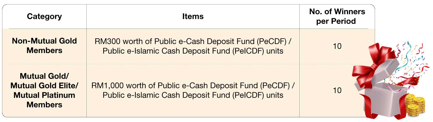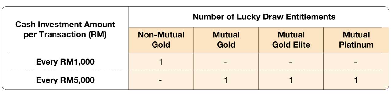 Non-Mutual Gold investors can earn up to 9 lucky draw entries while Mutual Gold, Mutual Gold Elite and Mutual Platinum members can earn up to 18, 36 and 54 lucky draw entries respectively.
